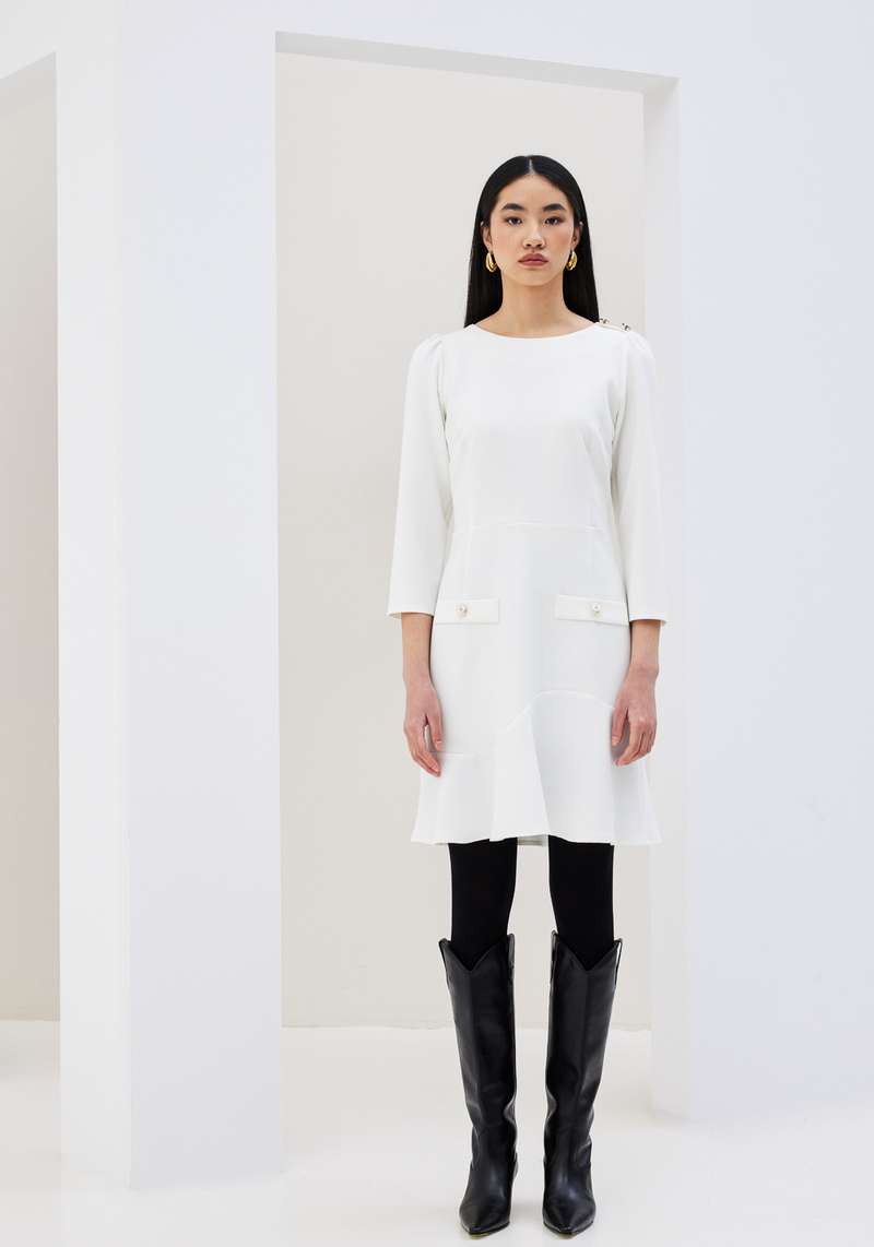 This elegant dress, available in ivory, black, and blue, features a flattering A-line silhouette with a round neckline. Designed with decorative flap pockets and pearl-like buttons at the front, it offers a refined yet modern touch. The soft, structured fabric provides comfort with a hint of stretch, making it ideal for both daytime sophistication and evening style.