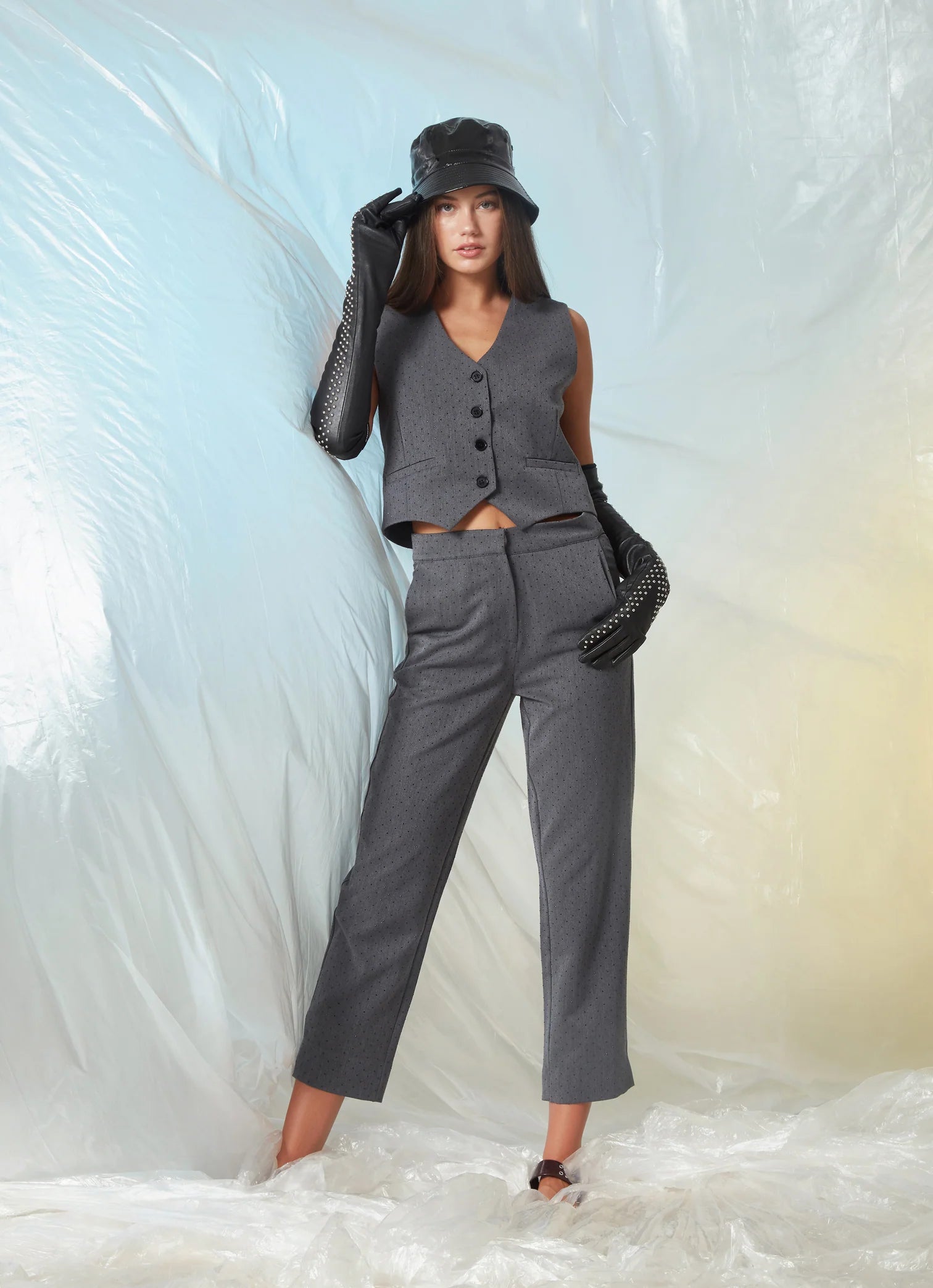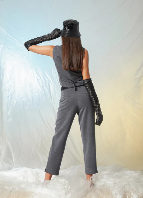 A sharp, contemporary vest featuring a deep V-neckline and a clean button-front closure. Its cropped cut and tailored fit create a refined, modern silhouette that transitions effortlessly from day to night. A perfect piece for layering or making a polished solo statement.