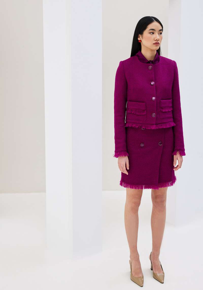 Add a touch of classic elegance to your wardrobe with this fringed tweed mini skirt, designed to blend sophistication with modern flair. Crafted from a richly textured tweed fabric, the skirt features a flattering high-waisted silhouette. This versatile piece pairs perfectly with its matching Tweed jacket or can be styled separately with a blouse or knit for effortless chic. Available in purple, black, and greeen colors.