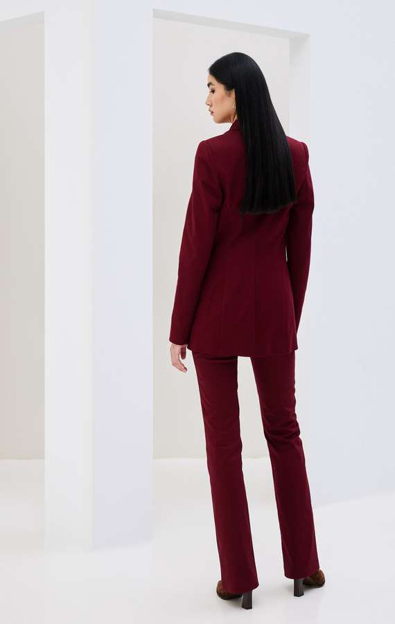 Crafted in a rich burgundy, the Burgundy jacket blends sophistication with bold femininity. This jacket features strong shoulders, a peak lapel, and a flattering longline cut. Detailed with tonal buttons and flap pockets, it brings timeless polish to both professional and formal ensembles. Style it with matching trousers for a statement power suit or dress it down with denim for a modern twist.