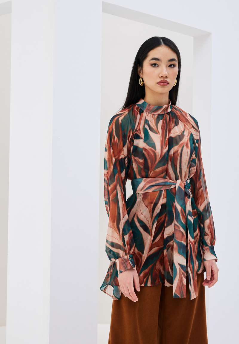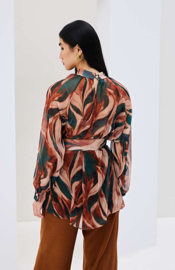 Elevate your wardrobe with thiis elegant chiffon blouse, featuring a striking leaf print in rich autumnal tones of spive, emerald, and blush. Designed with a high neckline, softly gathered shoulders, and a fluid silhouette, this blouse brings a refined touch to any occasion. The lightweight fabric drapes beautifully, while the matching fabric belt cinches the waist for a flattering, feminine fit.